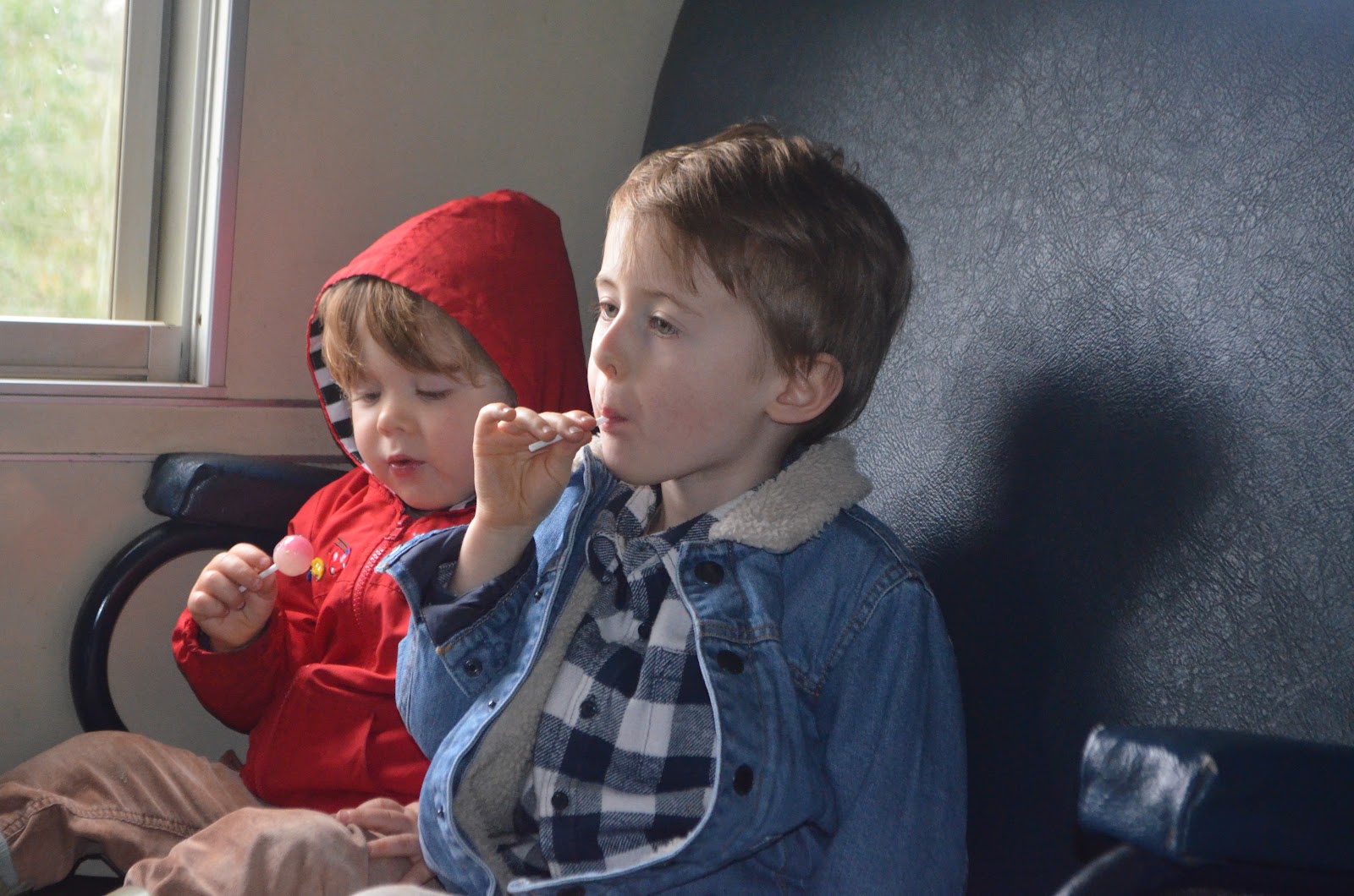 The return trip wasn't quite as exciting as the first hour of the ride...a lolly pop kept them happy while looking out the windows.